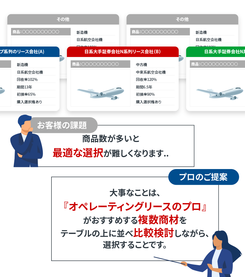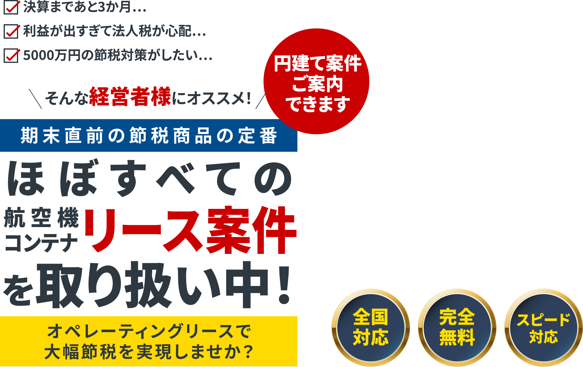 たとえば、航空機や船舶のオペレーティングリースに出資した場合、法人様であればリース費用を減価償却費として経費計上することで利益を圧縮し、企業の税金対策(税の繰り延べ)に。